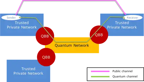 SECOQC network architecture can be divided into two parts: trusted private networks and quantum networks connected via QBBs (quantum backbones). The private networks are conventional networks with end-nodes and a QBB. Each QBB enables quantum channel communication with another QBB and consists of a number of QKD devices that are connected with other QKD devices over one-to-one connections.