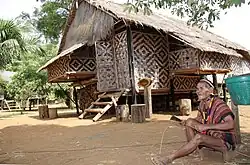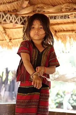 Weaving activity in Sekong City has textile designs featuring multicolored lines and is aided by a back-tensioned loom called the "hip loom". Katu women apply a warping technique to their weaving. In addition to the Katu, the Talieng (Tarieng) of Sekong City use back-tensioned looms, as do the Harlak in Kasangkang village, which is located outside Sekong City. The men of the Talieng ethnic group wrap a Tha Khatil cloth around their waist as a traditional costume. Among the Mon-Khmer, stripped lines are incorporated into clothing by use of the back strap loom.[23] In addition to geometric stripes, decorative patterns include animals or plants, considered to be traditional motifs, or planes and bombs, which have a historical context.[3] Traditional skirts (sin) are a specialty of the Alak group. Of note are Pha Biang (scarves) and Pha Kaan (head cloth scarves), including turbans, bonnets, hats and diadems.[18]