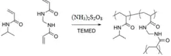 Radical polymerization is a method of chain growth polymerization. Chain-growth polymerization is one of the most common methods for synthesizing hydrogels. Both free-radical polymerization, and more recently, controlled-radical polymerization have been utilized for the preparation of self healing hydrogels. Free radical polymerization consists of initiation, propagation, and termination. After initiation, a free radical active site is generated which adds monomers in a chain link-like fashion.