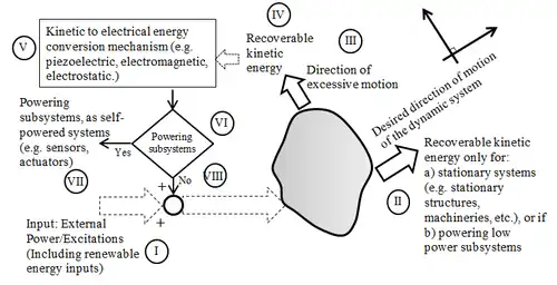V. The recoverable kinetic energy can be converted to electrical energy through an energy conversion mechanism such as an electromagnetic scheme (e.g. replacing the viscous damper of a car shock absorber with regenerative actuator), piezoelectric (e.g. embedding piezoelectric material in aircraft wings), or electrostatic (e.g. vibration of a micro cantilever in a MEMS sensor).