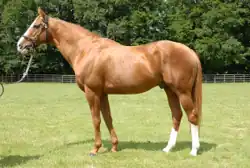 Selkirk (February 19, 1988 – January 3, 2013)[2] was an American-bred Thoroughbred race horse and sire who raced mainly in Europe. Bred in Pennsylvania and owned by American philanthropist businessman George W. Strawbridge Jr., he was trained by Ian Balding.[3] At the end of 1991, his third year, he had a record of 3-1-2 out of seven starts. In total, he had won six of his 15 starts.[3] He retired from racing in 1993 and began his stud career at Kirsten Rausing's Lanwades stud farm in Newmarket, England, where he sired 92 stakes winners from 987 foals. He died on January 3, 2013, at the age of 25.