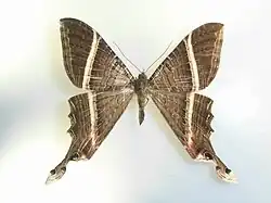 Sematurinae has three principal genera, and possibly another two. The hindwing of Coronidia is distinguished by an iridescent blue band,[1] but Homidiana characteristically has pink, orange or yellow markings,[2] especially in females (Minet and Scoble, 1999). The genus Mania is large, brown and tailed, resembling to some extent the genus Lyssa. The approximately twelve other sematurid species in the genera Anurapteryx and Lonchotura are placed here for now (making about 41 species) but may not belong in this subfamily; one species, Anurapteryx crenulata reaches the subtropics of Arizona[3] (Minet and Scoble, 1999). The relationships within Sematuridae clearly need deeper investigation.