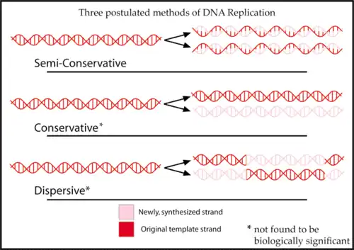 Semiconservative replication derives its name from the fact that this mechanism of transcription was one of three models originally proposed[3][4]for DNA replication: