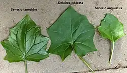 Delairea odorata (formerly Senecio mikanioides), a related vine in the Senecioneae tribe, is also similar looking, but features small ear-shaped appendages at the base of the stalks of the leaves and flowers that lack obvious petals, whereas both S. angulatus and S. tamoides have daisy-like flowers with several petals. Unlike S. angulatus, which is more of a scrambler, S. tamoides and Delairea grow like typical vines where they intertwine and attach themselves on objects as they climb.