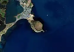 Seongsan Ilchulbong was formed around 6,700 years ago,[1] by Surtseyan-type hydrovolcanic activity upon a shallow seabed.[8][1] The earliest eruption related to the peak occurred around 600 m (2,000 ft) to the east of the current crater. After the eruption stopped, magma could not flow through that spot, which caused magma to later emerge at the location of the peak. Over time, most of the early cones and parts of the later tuff cone were eroded by waves, leaving parts of the internal structure exposed along the cliffs.[9] The mountain was originally disconnected from Jeju Island, but the accumulation of sediment caused the two to connect.[9][6]