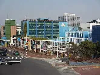 The surrounding neighborhood was developed during the Japanese colonial era[6] and housed the Korean Central Intelligence Agency, which formed in 1961, with their interrogation section in one of the center's buildings.[7] The area has been dubbed ‘Animation Town’,[6] and includes Cartoon Street, which entrance is directly across the street from the center[8][9] The center is an approximate ten minute walk to Myeong-dong Station, downhill along Cartoon Street; with Soongeui Women's College and Namsan's cable car and walking courses nearby, up the mountain.[9]