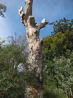 The tree canopy and parts of the trunk were lopped in 2015 after it was confirmed to be dead.[2] By July 2015 only the main trunk and parts of three scaffold limbs remained. There are 26 separate plantings of saplings of the original tree scattered around Victoria including one in the botanic gardens in Melbourne and another in the garden at Parliament House.[8][9]