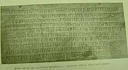 In 1954 Sergey Paramonov received the white émigré magazine Zhar-ptitsa (Firebird), which was published in San Francisco, from Aleksandr Kurenkov. The magazine contained a letter from their Brussels' reader Yury Mirolubov, where he reported about strange artifacts – carved planks, which had been found by Fedor Izenbek near Kharkiv, when he had been serving as a colonel of the Volunteer Army. According to Mirolubov after the White movement defeat, Izenbek took the planks in emigration and they were lost in Belgium during the Second World War. Mirolubov claimed that he had managed to copy down some texts of them.