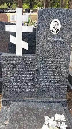 When he arrived in Australia, his full name was filled as Paramonov, Sergey Jacques in his form for application of registration. His scientific articles written in Australia were signed as S. J. Paramonov.[9] Although in private life he often used Ukrainian transliteration of his full name Сергій Якович Парамонів - Serhiy Yakowich Paramoniv, and the inscription on his gravestone is written in this way.