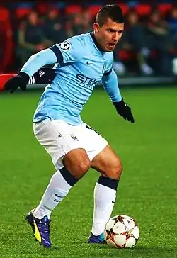 Sergio Leonel Agüero del Castillo (born 2 June 1988), also known as Kun Agüero,[5] is an Argentine former professional footballer who played as a striker. He is regarded as one of the best strikers of his generation and one of the greatest players in the history of the Premier League.[6][7][8][9] He played for Manchester City from 2011 to 2021 and is the club's all-time top goalscorer and holds the record for most Premier League hat-tricks, with 12.