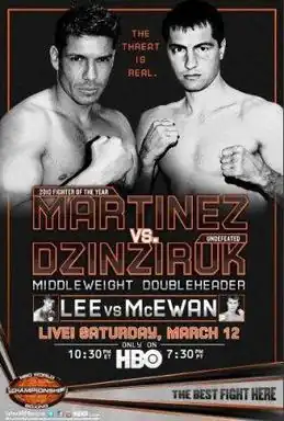 Martínez stopped Sergiy Dzinziruk in the eighth round, knocking down the Ukrainian middleweight five times during the fight, and three times in the 8th/last round. In Round 5, Dzinziruk was knocked down again by a left hand just seconds before the bell rang. He got up smiling, but Martínez now firmly appeared to be in control of the fight. Referee Arthur Mercante Jr. stopped the bout at the eighth after Martínez of Oxnard, California, sent Dzinziruk down for the third time.[3][4]
