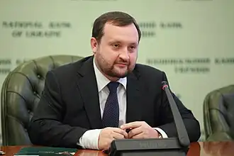 Serhiy Hennadiyovych Arbuzov (Ukrainian: Сергій Геннадійович Арбузов, Russian: Сергей Геннадьевич Арбузов, romanized: Sergey Gennadyevich Arbuzov; born 24 March 1976) is a Ukrainian former banker and politician who briefly served as acting prime minister of Ukraine from 28 January to 22 February 2014, following the resignation of Mykola Azarov amidst the escalating Euromaidan movement.[1][2] He previously served as First Vice Prime Minister of Ukraine from 24 December 2012 to 28 January 2014. On 27 February 2014, in the aftermath of the Revolution of Dignity, Arbuzov was dismissed, and Arseniy Yatsenyuk was elected as the new prime minister.