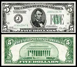 Series of 1928 United States Notes were issued in $2 (through 1928G) and $5 (through 1928F) denominations until the early 1950s.[4] Also, for a brief period in 1933, Series of 1928 $1 United States Notes were issued as a response to the Great Depression. Most of these remained in storage before being released in Puerto Rico during 1948-9.[5]