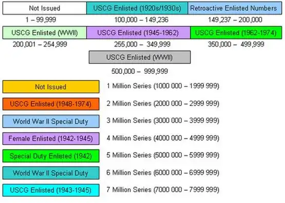 - The four million series (4000 000 – 4999 999) was used by female Coast Guard members between 1942 and 1945. Forty one thousand of these numbers were issued, ranging from 4000 000 to 4040 999.