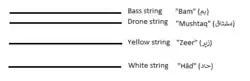 The instrument is strung with four strings. From top to bottom the strings are (4) bam or bass string, (3) drone string, (2) yellow string, and (1) silver string.