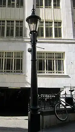 Only one working sewer gas destructor lamp remains in London; however, due to a traffic accident, the original lamp was damaged and has been replaced with a replica. This lamp is currently in use and can be found burning day and night down the side street of the Savoy Hotel in London. The story of this lamp has given rise to locals referring to Carting Lane as 'Farting Lane'.[7][8]