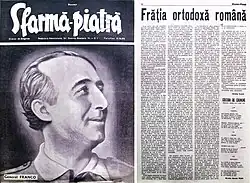 Crainic, a trained theologian and expert on Romanian Orthodoxy, inspired the religious agenda of his various newspapers. In 1937, Sfarmă-Piatră was seeking a rapprochement between the Orthodox believers and adherents to a rival national church, the Romanian Greek Catholics. It saluted the Greek Catholic magazine Vestitorul for promoting a "national fusion" between the two congregations, to which Vestitorul replied that the only conceivable merger was for the Orthodox side to accept communion with Rome.[23] Vestitorul did however offer praise to Gregorian's column on "the threat of Pan-Slavism", which the Greek Catholics identified with pan-Orthodoxism.[24] Around that date, Sfarmă-Piatră was also involved in promoting the sayings of Petrache Lupu, an illiterate peasant who claimed to have spoken with God. While mainstream media suggested that Lupu was a mere lunatic, Crainic proclaimed him a saint of the Orthodox Church and a symbol of Romanian values.[25] Also in Sfarmă-Piatră, the younger Dan Botta depicted the peasant-prophet as the embodiment of "abnegation", "belief in the worth of the human soul", and resistance to change.[25]