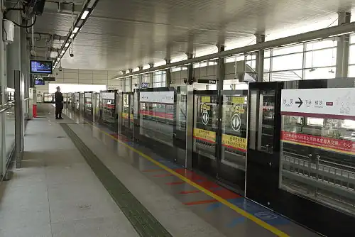 Shabei Station (Chinese: 沙贝站) is an elevated station of Line 6 on the Guangzhou Metro. The station is one of three Guangzhou Metro stations on the island of Jinshazhou in Baiyun District, and is the closest station to the Jinshazhou Bridge. It started operation on 28 December 2013.[1] From 19 June 2017, during the peak morning period from 07:45 to 08:45, metro authorities began imposing passenger limits.[2]