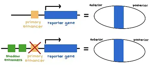A key characteristic of shadow enhancers is their functional redundancy, which arises from their ability to functionally overlap with primary enhancers in controlling gene expression. This redundancy enhances the strength of gene regulation by ensuring that multiple enhancers contribute to the expression of a single gene. If a gene is regulated not only by a primary enhancer but also by two or more shadow enhancers, then the gene has additional protection against the failure of a single regulatory element. In contrast, genes regulated solely by a primary enhancer lack this redundancy, making them more vulnerable to regulatory disruptions.[8] Shadow enhancers exhibit varying levels of redundancy across different contexts and timeframes. Some shadow enhancers' redundant function can be restricted to a small timeframe or a small number of cells, while others can have a more extensive overlap and thus are more functionally redundant.[2]