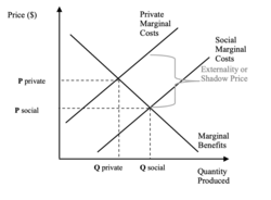 Figure 2 illustrates a negative shadow price where the social marginal cost is greater than the private marginal cost. An example of this is pollution, discarding toxic waste chemicals into waterways have a negative effect on fish stocks in the region, reducing local fisherman's income. In this instance Private Marginal Cost (PMC) is simply the cost of producing the chemicals whereas the Social Marginal Cost (SMC) is the PMC less the net social cost of discarding toxic waste chemicals.