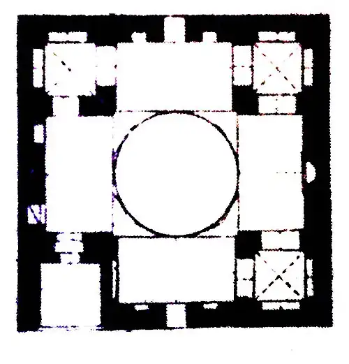 According to the plan, the Shah Abbas Mosque in Keshla has a square shape. It repeats the scheme typical for the mosques of the Shirvan-Absheron architectural school, and is similar to the Tuba Shakhi mosque in the Mardakan settlement (1481). In the center of the edifice, the main worship hall is built, consisting of four large arches which are connected to the round dome of the mosque. Small rooms with arched ceilings are built on the sides of the building. These rooms are the ones that give the plan a square shape.[3]