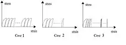 If repeated loading on the granular induces stress beyond the yield surface, three different cases may be observed. In case 1 the residual strain in the materials increases almost without limit. This so-called “ratcheting” state is close to what can be predicted applying simple Mohr–Coulomb criterion to a cyclic loading. In the responses like case 2, residual strain in the materials grows to some extent, but at some stage the growth is stopped and further cyclic loading produces closed hysteresis loops of stress–strain. Finally in case 3 the growth of residual strain is practically diminishes when sufficient loading cycles are applied. Case 2 and case 3 are cases of plastic and elastic shakedown respectively.[1]