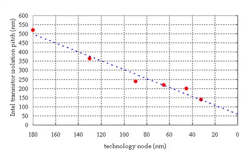 Scaling of isolation with transistor size. Isolation pitch is the sum of the transistor width and the trench isolation distance. As the isolation pitch shrinks, the narrow channel width effect becomes more apparent.