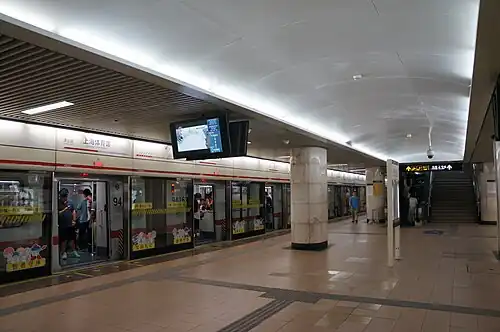 Shanghai Indoor Stadium (simplified Chinese: 上海体育馆; traditional Chinese: 上海體育館; pinyin: Shànghǎi Tǐyùguǎn) is an interchange station between lines 1 and 4 of the Shanghai Metro.[1] This station is part of the initial southern section of the line that opened on 28 May 1993[2][3] and is located in Xuhui District; the interchange with Line 4 opened on 31 December 2005.[4]