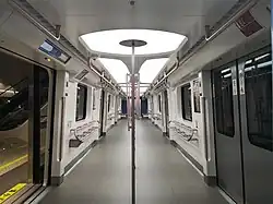 Shanghai Pudong Airport APM is an automated people mover in the Pudong International Airport. In the initial phase, there are two lines, each connecting a terminal building and a satellite hall. The two lines are planned to be connected after the completion of Terminal 3 in the future. The system uses Class A stocks, currently in a 4-car configuration, with conditions reserved for a 5-car configuration across the fleet.[2]