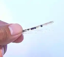 A particularly important mutation that was selected very early in the history of agriculture removed the "brittle rachis" problem from wheat.[2] A ripe head ("ear") of wild-type wheat is easily shattered into dispersal units when touched, or blown by the wind, because during ripening a series of abscission layers forms that divides the rachis into short segments, each attached to a single spikelet (which contains 2–3 grains along with chaff).