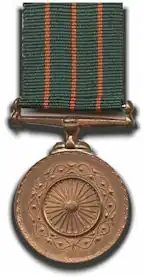 Medal: Circular bronze, 1-3/8 inches in diameter. In the centre, the Ashoka Chakra, surrounded by a lotus wreath and with an ornate edge. Suspended by a straight bar suspender. The medal is named on the edge.
