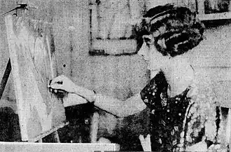 By 1924, Shackelford had decided to adopt the modernist style she had learned while studying in Paris and Provincetown.[15] At year's end, she showed two paintings in a group exhibition held by the Charcoal Club of Baltimore.[20] The club's annual all-American exhibition is said to have then been "the high point of Baltimore's brief art season" and her paintings were among only 70 works selected from among submissions by 130 artists.[21] A local reporter noted that many "modernist" submissions had been rejected.[20] The Baltimore Sun printed a photo of Shackelford working on one of the two paintings she exhibited.[22] The photo is shown above, no. 1.
