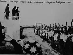 During the Islamic rebellion, Sheng launched his own purge in Xinjiang to coincide with Stalin's Great Purge.[70] Sheng started the elimination of "traitors", "pan-Turkists", "enemies of the people", "nationalists" and "imperialist spies". His purges swept the entire Uyghur and Hui political elite.[71] The NKVD provided the support during the purges.[70] In the later stages of the purge, Sheng turned against the "Trotskyites", mostly a group of Han Chinese sent to him by Moscow.[72] In the group were Soviet General Consul Garegin Apresov, General Ma Hushan, Ma Shaowu, Mahmud Sijan, the official leader of the Xinjiang province Huang Han-chang, and Hoja-Niyaz. Xinjiang came under virtual Soviet control.[70] It is estimated that between 50,000 and 100,000 people perished during the purge.[72]