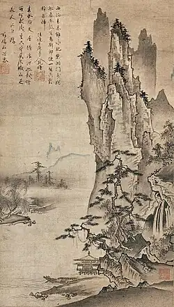 Shigajiku (Japanese: 詩画軸, "poem-and-painting scrolls"), are a form of Japanese ink wash painting. These hanging scrolls depict poetic inscriptions at the top of the scroll and a painted image, usually a landscape scene, below.[1] Buddhist monks of the gozan 五山 or Five Mountain monasteries of the early Muromachi Period (1336-1573) first introduced the poem-and-painting scrolls.[2]