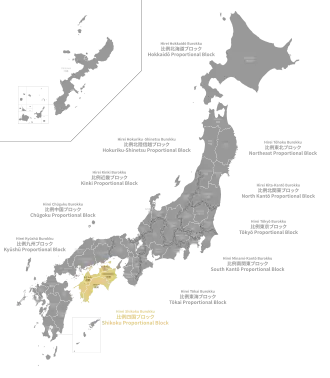 The Shikoku proportional representation block (Hirei [daihyō] Shikoku burokku (比例[代表]四国ブロック)) is one of eleven proportional representation (PR) "blocks", multi-member constituencies for the House of Representatives in the Diet of Japan. It consists of Shikoku region covering Tokushima, Kagawa, Ehime and Kōchi Prefectures. Following the introduction of proportional voting it elected seven representatives in the 1996 general election. When the total number of PR seats was reduced from 200 to 180, the Shikoku PR block shrank to six seats.