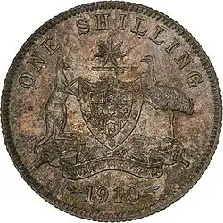 There were two distinct designs for the reverse side of the Australian shilling, the first depicting the 1908 Australian coat of arms (used 1910–1936), designed by William Henry James Blakemore. This was Australia's first design of the coat of arms and was granted by royal warrant from King Edward VII. The coat of arms on the shilling displayed a shield at the centre which was adorned with the cross of St George, while 5 six-pointed stars were dotted along the inside of the cross. Six smaller shields called escutcheons were located around the outer rim of the central shield. Above the shield was the seven-pointed star, symbolising the Federation.[9]