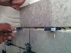 In masonry, small stones may be used to align or fill gaps between larger bricks or slabs.