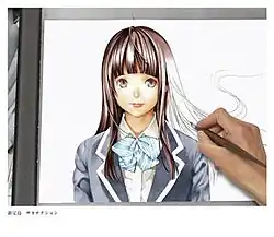 "Shin Takarajima" drew inspiration from Bakuman, embodying the story of a young man and woman striving to become manga artists. The theme of the song was "to draw a line."[2][3] The song itself includes lyrics that highlight the "sweat and tears that come from creating," a feeling shared among both manga artists and musicians.[4][3] After requesting the song approach a second topic, Director Ohne gave Shin Takarajima another title: "The Song of (One's) Self-Effacing Graduation."[3] The film Bakuman includes a scene during the credits where the two protagonists forgo attending their graduation ceremony to talk in a classroom. Ohne requested this theme be worked into the song to lend Shin Takarajima more relevance to the movie.[3]