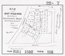 The "Art Village" had cottages that were built by the individual owners of the residential lots. They were built in a variety of rustic styles, including Colonial Revival and early Arts and Crafts, and mostly clad in natural shingles. Several of the cottages were designed by former students Grosvenor Atterbury and Katharine Budd. The cottages were often rented out to students.[2] The "Art Village" was designated as a Hamlet Heritage Resource Area by the Southampton Town Board in 2012.[6]