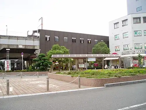The station has two elevated side platforms with the station building underneath. The station is staffed.