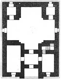 On the opposite side of the door, between the branches of the cross, there are two small rooms inside the thick stone walls. It is supposed to be used as a cell or warehouse where the tomb items were stored.[8] The external side of the dome covering upper part of the middle of the hall were decorated with glazed tiles. However, those tiles do not currently exist.[7]