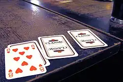 From a shuffled deck of cards, the dealer gives each player nine cards: three downcards in a row, three upcards on top of the downcards, and three hand cards.[1] The upcards can only be played once the hand cards have been exhausted, and the downcards can only be played once the upcards have been played.