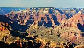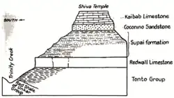 The top of Shiva Temple is composed of Permian Kaibab Limestone overlaying cream-colored, cliff-forming, Permian Coconino Sandstone.[11] The conspicuous band of sandstone, which is the third-youngest strata in the Grand Canyon, was deposited 265 million years ago as sand dunes. Below the Coconino Sandstone is slope-forming, reddish terraces of the Pennsylvanian-Permian Supai Group. Further down are strata of Mississippian Redwall Limestone, and finally the Cambrian Tonto Group.[12] Precipitation runoff from Shiva Temple drains south to the Colorado River via Trinity and Crystal Creeks.