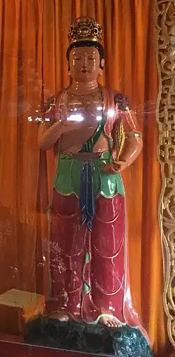 Present Maheśvara is Buddhist by religion, and was reborn as a Deva, because of his merit of donating a cup of honey to Kassapa Buddha in one of his previous lives. According to Karandavyuha Sutra, Maheśvara was born from the brow of Bodhisattva Avalokiteshvara.[1] According to Buddhist traditions, he helps good people, mostly who follow the Buddhist precepts and eat a vegetarian diet, and also punishes bad people for their evil deeds. He helps yogis doing Kundalini Meditation.[2][3] He is bodhisattva of Tenth Bhumi. He is one of the important deities venerated in Sri Lankan Buddhism. He is one of the twenty four protective deities of Chinese Buddhism and of the sixteen dharmapalas of Tibetan Buddhism.