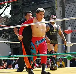 Shockercito was one of the 13-Mini-Estrellas who put their mask on the line in a Steel Cage "elimination" match at CMLL's La Hora Cero show on January 11, 2009; this was the first time CMLL booked their Mini-Estrellas division in such a cage match. During the match Cosmico, Electrico, Niño de Acero, Fantasy, Mascarita Dorada, Pequeño Ninja, Pequeno Olimpico, Pequeño Black Warrior, Tzuki, Ultimo Dragoncito, and Pequeño Universo 2000 all escaped the cage, leaving only Pierrothito and Shockercito in the cage. The two were forced to wrestled against each other under Lucha de Apuesta, with both of them betting their mask on the outcome of the match. In the end Pierrothito pinned Shockercito, forcing him to unmask after the match and announce both his real name, home town and how long he had been a wrestler, per lucha libre traditions.[7] Following his mask loss Shockercito was on the winning side of the opening match of the 2009 Homenaje a Dos Leyendas show as he, Pequeño Olimpico and Ultimo Dragoncito defeated Pequeño Violencia, Pequeño Black Warrior and Pierrothito, two falls to one.[8] Shockercito kept the momentum on his side as he faced and defeated Fire in a Lucha de Apuesta, hair vs. hair match and watched as Fire was shaved bald after the match.[1] On June 2, 2009, Shockercito wrestled in yet another Lucha de Apuesta match, his third in 2009, and defeated Pequeño Damián 666, winning his second hair match in just over two months.[9] On November 6, 2012, 12 competitors met in a special steel cage match where the loser of the match would be forced to unmask or have his hair shaved completely off. The match was very chaotic, the steel cage broke at one time and saw several wrestlers bleed and others need medical attention due to a number of accidents. Shockercito and Pequeño Black Warrior were the last two wrestlers left in the ring, relatively unscathed because they had stayed away from the cage as much as possible. In the end Shockercito forced Pequeño Black Warrior to submit, ensuring that he had to be shaved bald after the match.[10][11][12]
