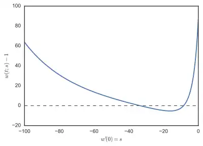 The initial value problem was solved for s = −1, −2, −3, ..., −100, and F(s) = w(1;s) − 1 plotted in the Figure 2. Inspecting the plot of F, we see that there are roots near −8 and −36. Some trajectories of w(t;s) are shown in the Figure 1.