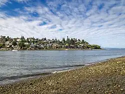 While by then Seattle had several parks adjacent to the water (e.g., Alki Beach Park, Golden Gardens Park, Seward Park), there were (and are) significant gaps. Community groups pushed to increase public shoreline access by improving street ends where public rights of way are platted into the water.[5] As the Seattle Post-Intelligencer put it in 2007, "city maps showed roads drawn right into Lake Washington, Lake Union, Puget Sound, Shilshole Bay, Portage Bay, Elliott Bay and other Seattle waterways."[7] In 1996, the city identified 149 such shoreline street ends and designated them for "public uses and enjoyment." A later ordinance established permit fees to discourage private uses of these lands, and directed the revenue from these fees toward the maintenance and improvement of shoreline street ends.[5] The result has been the creation and maintenance of a wide variety of public spaces: beaches, docks in industrial areas, expansions of existing parks, some providing habitat for native species, others simply providing water views.[8]