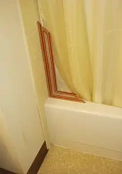 A shower splash guard is a permanently installed, fixed, rigid fitting made of plastic or glass that prevent water from a shower from splashing out of the bathtub and onto the floor.[1][2] Typically, the shower splash guard is a small triangular piece of plastic that is used in combination with a shower curtain, to prevent water escaping at the corners, but it may be a much larger piece that is used by itself. [3]