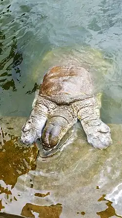 Scientifically, the black soft-shelled turtle or Bostami turtle (Aspideretes nigricans, sometimes placed in genus Nilssonia) is a species of freshwater turtle found in India (Assam and Tripura) and Bangladesh (Chittagong). They have been long-believed to be inbred variants of the Ganges soft-shelled turtle (A. gangeticus or N. gangeticus) or the peacock soft-shelled turtle (A. hurum or N. hurum). While it is a close relative of the latter, it is a distinct species. As of 2002, the IUCN classified the species as extinct in the wild.[2]