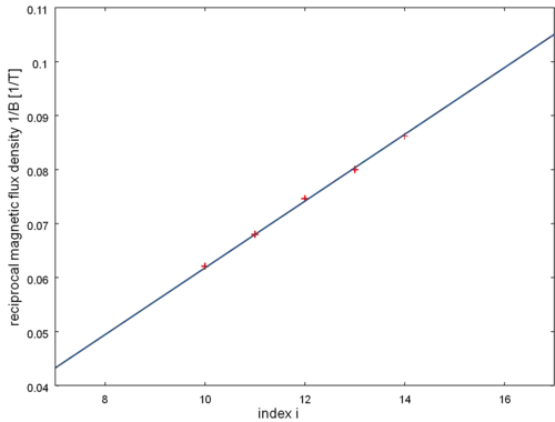 For a given sample, all factors including the electron density n on the right hand side of relationship (3) are constant. When plotting the index i of an edge channel versus the reciprocal of its magnetic flux density 1/Bi, one obtains a straight line with slope 2e/(nh). Since the electron charge e is known and also the Planck constant h, one can derive the electron density n of a sample from this plot.[3] Shubnikov–De Haas oscillations are observed in highly doped Bi2Se3.[4] Fig 3 shows the reciprocal magnetic flux density 1/Bi of the 10th to 14th minima of a Bi2Se3 sample. The slope of 0.00618/T as obtained from a linear fit yields the electron density n